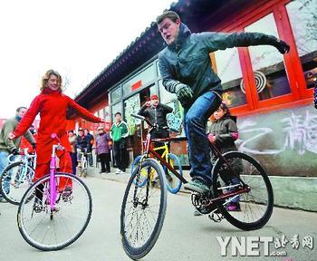 只能通過一輛小轎車的五道營胡同,幾十名“老外”耍起車技,昨天(7日)下午,來自美國、德國、英國、法國等十六個國家的五十余名外國朋友用自行車表演,與“胡同鄰居”共同倡導“綠色出行、低碳生活”主題。