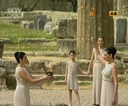 中新網3月24日電 北京時間今天下午5時,北京奧運圣火采集儀式在希臘的赫拉神廟前點燃,希臘演員瑪利亞-娜芙普利都出任最高女祭司。