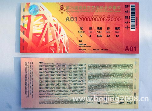 以北京奧運會主場館“鳥巢”和祥云圖案為主要視覺元素的開幕式門票,主題明確、色彩協調、采用了防偽技術。采用紅黃色彩,在祥云的映襯下充滿力量,色彩鮮明奪目,體現了開幕式應有的慶典氣氛。