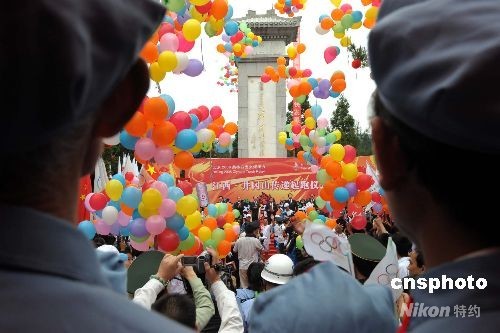 5月15日,奧運圣火開始在江西井岡山傳遞,在起跑儀式上穿著紅軍服裝的合唱隊為祥云火炬傳遞鼓勁加油。 中新社發 廖攀 攝