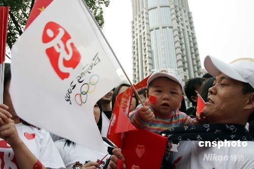 五月二十三日,奧運火炬開始上海站傳遞,未滿周歲的上海幼童也加入上海市民迎接圣火的行列。 中新社發(fā) 潘索菲 攝