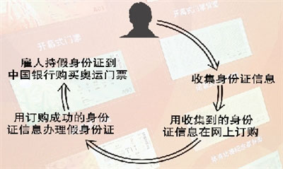 5月13日,在中國職工之家內的中國銀行,兩名男子持假身份證購買奧運門票。警方將兩人帶走審訊后,成功搗毀了一個搜集身份證信息制造假證,網上訂票后高價倒賣的團伙。該團伙的奧運發財夢,因假證被識破而破滅。