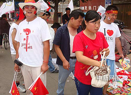 記者上午在運城的街頭看到,各家商戶門面都懸掛奧運彩旗,出租車、三輪車、摩托車等都自發(fā)的在車頭車尾插上彩旗。印有各色奧運標志圖案的文化衫火了運城的一條街。