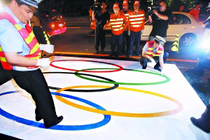 昨晚9點,記者在三元橋下出京方向看到,一塊約6米見方的白色色塊被粘在車道上,施工人員用卡尺畫出奧運五環標志的輪廓,然后再鋪上黑、綠、紅等彩條。