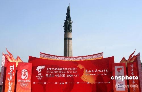 7月11日,北京奧運(yùn)火炬在哈爾濱傳遞,從防洪紀(jì)念塔前起跑。1957年,松花江洪水威脅哈爾濱,全市人民眾志成城戰(zhàn)勝洪水襲擊,并于次年建立此塔以志紀(jì)念。 中新社發(fā) 周兆軍 攝