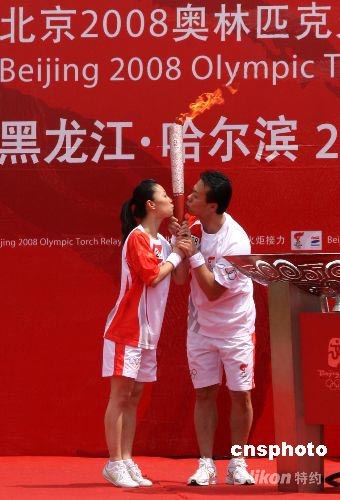 7月11日,北京奧運火炬在“冰城”哈爾濱傳遞,火炬手著名花樣滑冰世界冠軍、“冰上情侶”申雪、趙宏博,在點燃圣火盆前共同深情地親吻“祥云”火炬。中新社發(fā) 周兆軍 攝