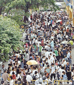 七月十四日,離中銀香港發行面額二十元港幣的奧運紀念鈔票還有兩天時間,香港中銀大廈外已有不少市民排隊等候。 中新社發 武仲林 攝