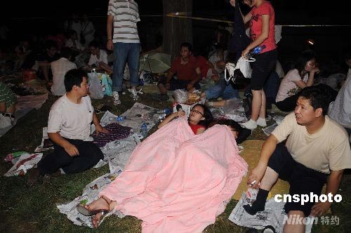 7月25日凌晨,北京兩萬余市民夜宿街頭苦盼“奧運票”。中新社發 陳文 攝