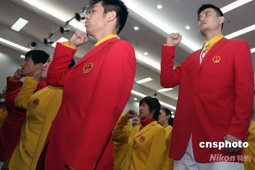 姚明、劉翔、朱啟南等面對國旗莊嚴宣誓。 中新社發 任晨鳴 攝