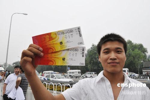 7月25日,第4階段最后82萬張北京奧運(yùn)會(huì)比賽門票向公眾發(fā)售,銷售異常火爆。早上7點(diǎn),銷售現(xiàn)場(chǎng)除了近2萬人在守侯排隊(duì)外,在排隊(duì)區(qū)域外,也有近萬人正在焦急等候進(jìn)入排隊(duì)區(qū)。圖為一位來自河南的張先生向記者展示剛買到的兩張奧運(yùn)門票。張先生說,他特地從河南趕過來,等了24個(gè)小時(shí)才買到票。中新社發(fā) 王宇婷 攝