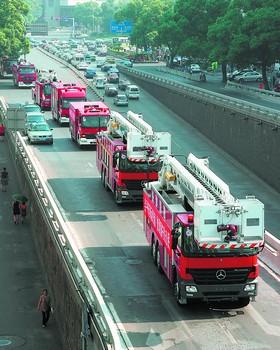 長(zhǎng)沙最先進(jìn)的消防車隊(duì)正通過(guò)袁家?guī)X路段。