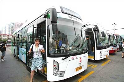 昨天(29日),氫燃料電池公交車在六里橋客運(yùn)中心亮相,這種零排放公交車將服務(wù)奧運(yùn)。記者范繼文攝