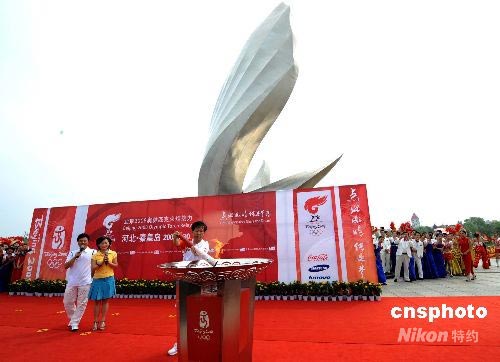 7月30日,奧運火炬在河北秦皇島傳遞,在傳遞終點奧林匹克公園,末棒火炬手中共秦皇島市委書記王三堂點燃圣火盆,奧運火炬在秦皇島站的傳遞結束。 中新社發 廖攀 攝
