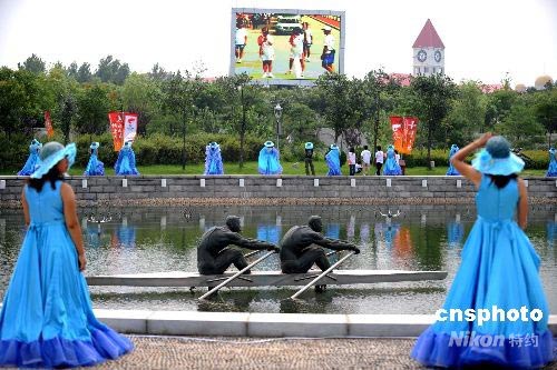 7月30日,奧運火炬在河北秦皇島傳遞,在傳遞終點奧林匹克公園,“海浪姑娘”等待火炬手到來。中新社發 廖攀 攝