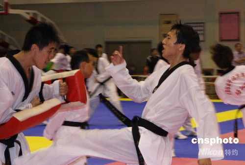 七月三十日,中華臺北隊跆拳道金牌選手朱木炎在高雄左營選手訓練中心訓練,備戰北京奧運會。 中新社發 曾嘉 攝