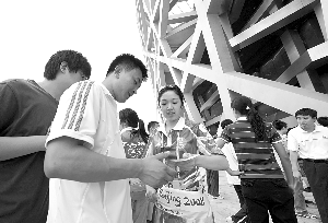 30歲的重慶人白先生帶著年過六旬的老母親觀看彩排,他們最近幾天才到北京的,連這里的路都沒熟悉。“頭一次來北京,就能提前看上奧運會,值!”白先生說,彩排票是一個朋友送的。他們從18時起坐了近一個小時的出租車才到達鳥巢附近,因交通管制無法停得太近,又走了半個小時才進場。“進門安檢太嚴了,打火機、瓶裝水、手機通通不讓帶。”白先生說,彩排票上要求手機不能拍照,“估計怕泄密,現在不能拍的手機都少。”