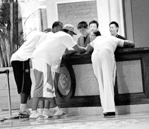 約兩小時后,4人才離開浴室返回酒店。貴為天王巨星,4人看來比打一場球賽更加疲累,在詢問處查詢時,竟然不顧身份,旁若無人地趴在詢問處柜臺上休息。直至酒店職員安排好,4人才不情愿地站起身返回房間。據(jù)悉,極受球迷歡迎的安東尼離開浴室時,雙手在自己身上做出不雅動作。