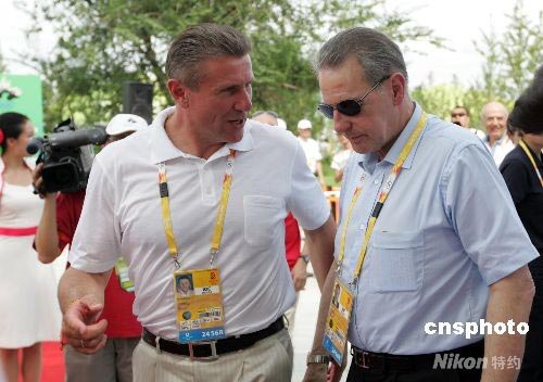 國際奧委會主席羅格與國際奧委會運動員委員會主席、前世界著名撐竿跳高運動員謝爾蓋·布勃卡(左)在一起交談。 中新社發 杜洋 攝