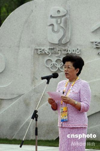 8月1日,北京奧運村“和平友誼墻”正式啟動。圖為北京奧運村村長陳至立在儀式上致詞。中新社發 杜洋 攝