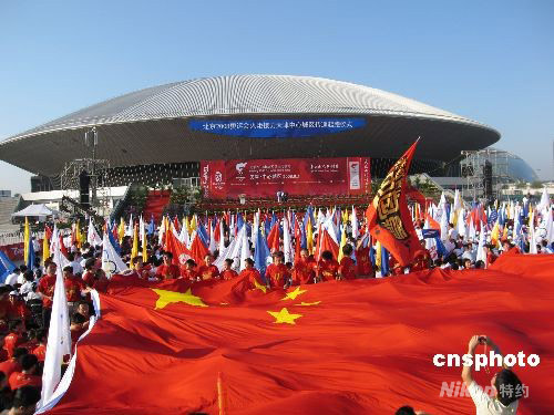 天津市民手托巨幅五星紅旗,祝福中國,祝福奧運。 中新社發 郭曉帆 攝