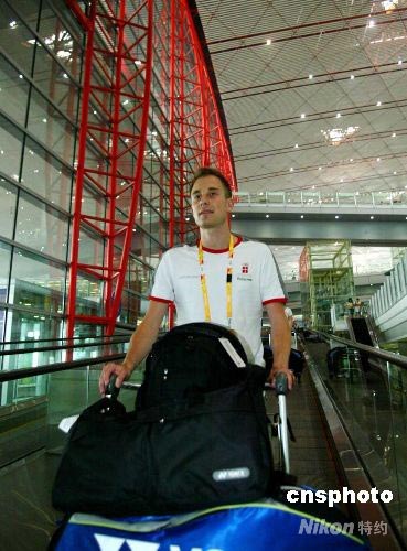 8月3日,丹麥著名羽毛球名將皮特·蓋德飛抵北京首都機(jī)場(chǎng),備戰(zhàn)北京奧運(yùn)。 中新社發(fā) 富田 攝