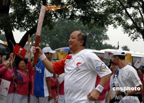 8月6日上午,奧運火炬北京站傳遞從午門正式開始。圖為著名作家劉冠軍擔任第3棒火炬手。中新社發 王東明 攝