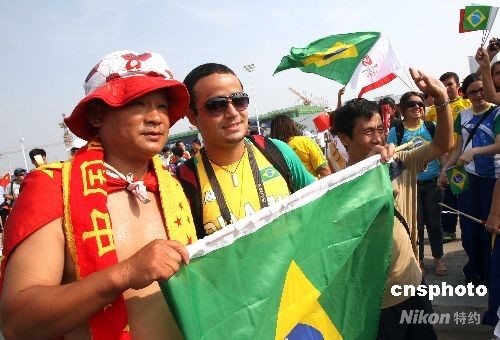 8月7日,巴西、中國球迷在北京奧運沈陽足球分賽場歡呼。當晚,男足巴西對比利時、中國對新西蘭將進行小組賽。中新社發 張宇 攝