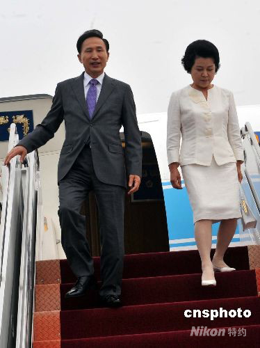 韓國總統李明博8月8日上午9 時許抵達北京,將出席北京奧運會開幕式及相關活動。 中新社發 宋吉河 攝