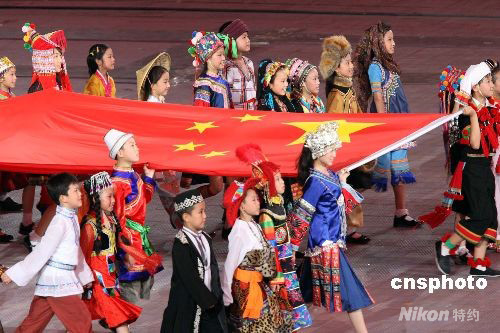 第二十九屆夏季奧運會8月8日晚在北京奧林匹克公園內的國家體育場舉行開幕式,中國各民族兒童簇擁著鮮艷的中國國旗入場。 中新社發 任晨鳴 攝