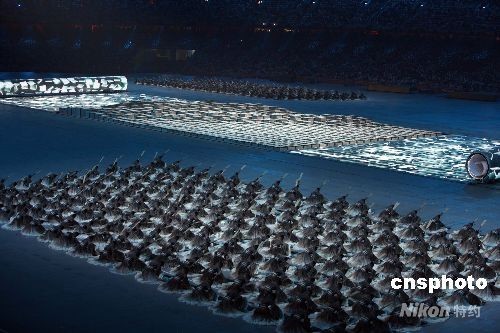 8月8日晚8時8分,第二十九屆夏季奧運會在北京的國家體育場——鳥巢隆重開幕。圖為開幕式文藝表演展現中國古老的活字印刷術。中新社發 任晨鳴 攝