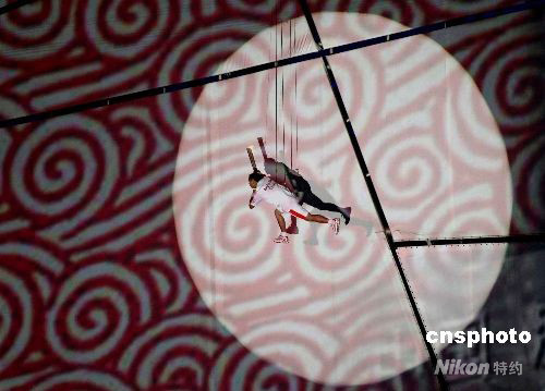 8月8日,第29屆夏季奧運會在北京奧林匹克公園內(nèi)的國家體育場“鳥巢”舉行。中國“體操王子”李寧飛繞“鳥巢”一周后點燃主火炬。 中新社發(fā) 任晨鳴 攝