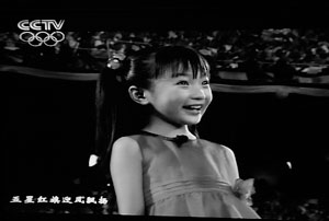 “五星紅旗迎風飄揚,勝利歌聲多么響亮……”清澈的童音響徹“鳥巢”上空,昨晚8時6分,北京奧運會開幕式升旗儀式前,一名身著紅色紗裙的女孩出現在電視畫面中,她緊攥拳頭,領唱《歌唱祖國》,隨后,代表56個民族的少年起舞、五星紅旗升起。