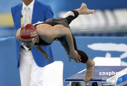 8月10日上午,在北京奧運會游泳決賽首日,中國選手張琳在男子400米自由泳項目上獲得銀牌,韓國選手樸泰桓和美國選手詹森分獲冠軍和第三名。這也是中國男選手首次獲得奧運會獎牌。中新社發 杜洋 攝