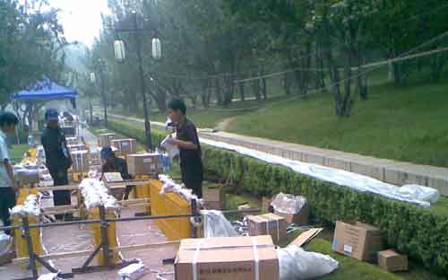 8月8號,早6時30分,負責安裝煙花的工人來到了現場,開始對煙花進行安裝調試。在安裝調試的過程中,出現了一個問題,由于現場有很多樹,部分樹枝可能會阻擋煙花發現的路徑,導致煙花不能正常發射,甚至造成火災。為了防止這種事故的發生,消防官兵對發射炮一一的做了檢查,認真計算其發現的軌道,盡量避免在發射軌道中出現樹枝等阻擋物。如果遇到實在不能避免的樹枝,即迅速與當地相關人員聯系,給與解決。通過大家的統統努力,所有的煙花在8月8號上午11點50分完成了安裝調試。到這時,消防官兵已經連續工作了15個小時,但是消防官兵知道現在還不能休息,只有到煙花綻放在空中那一刻,才能真正地放下心來。
