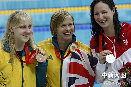 8月11日,北京奧運會女子100米蝶泳決賽,澳大利亞選手莉斯貝絲·特里克特以56秒73獲得金牌。中新社發 杜洋 攝