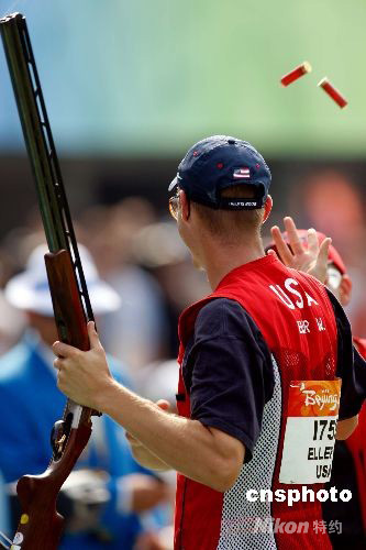 8月12日,北京奧運會男子飛碟雙多向決賽在北京射擊館進行,美國選手格倫·埃勒以190中獲得金牌。 中新社發 盛佳鵬 攝