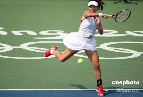 8月12日,中國網球名將鄭潔在北京奧運會女子網球單打第2輪比賽中,以2:1戰勝西班牙選手利亞戈斯特拉。 中新社發 武仲林 攝