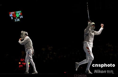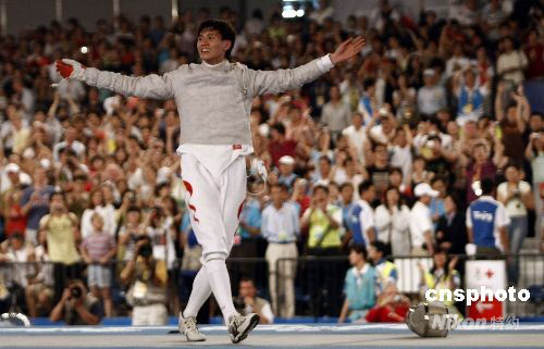8月12日晚,08北京奧運(yùn)會(huì)男子佩劍個(gè)人賽決賽在北京國際會(huì)議中心擊劍館揭開戰(zhàn)幕,賽會(huì)黑馬14號(hào)種子中國選手仲滿和法國選手洛佩茲在決賽中遭遇,結(jié)果中國選手仲滿以15-9戰(zhàn)勝對(duì)手獲得冠軍,這是中國男子擊劍在奧運(yùn)會(huì)上第一次獲得冠軍。 中新社發(fā) 盛佳鵬 攝