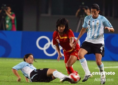 8月12日晚,奧運(yùn)女足小組賽第三輪賽事展開,中國女足對(duì)陣阿根廷隊(duì)。第50分鐘,中國隊(duì)右路起球,阿根廷門將出擊失誤沒摘到球,韓端與對(duì)方防守球員碰撞中把球打進(jìn)了球門。中新社發(fā) 劉新 攝