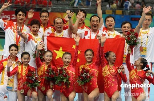 8月13日,北京奧運會女子體操團體決賽在北京奧林匹克公園內的國家體育館舉行,由程菲、何可欣、江鈺源、李珊珊、楊伊琳、鄧琳琳組成的中國體操女隊創造歷史,以總成績188.900分摘取桂冠,奪得中國體操歷史上第一枚奧運會女子團體金牌。圖為掛上金牌的小姑娘們與中國體操管理中心主任高健及全體教練合影。中新社發 任晨鳴 攝