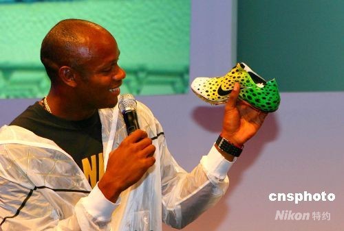 8月12日夜,世界短跑名將鮑威爾在北京發布強力短跑釘鞋,鮑威爾本人參與該跑鞋的設計過程。圖為他在展示該跑鞋。中新社發 沈晨 攝