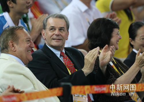 國際奧委會主席羅格在場下為打破世界紀錄的劉春紅精彩的表現鼓掌。中新社記者 武仲林 攝