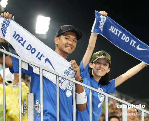8月14日晚,在北京五棵松棒球場進(jìn)行的中華臺北對日本之戰(zhàn)吸引了眾多臺灣球迷的目光。臺灣當(dāng)紅藝人陳建州(左)和范瑋琪(右)專程到場為中華臺北隊加油。 中新社發(fā) CNAsports 攝