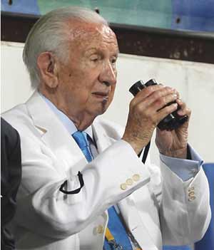 中新網8月15日電 據香港大公報報道,8月14日,國際奧委會終身名譽主席薩馬蘭奇在香港觀看奧運馬術盛裝舞步團體賽決賽。