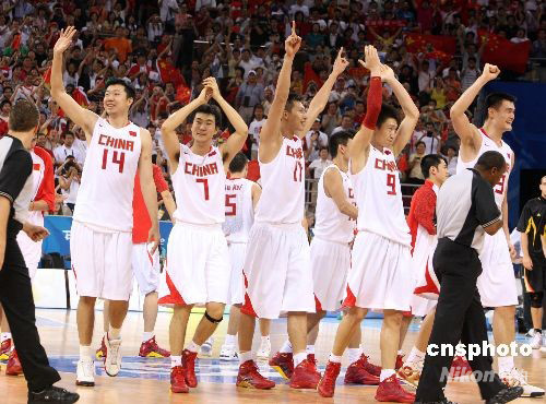 8月16日,北京奧運會男子籃球小組賽第四輪比賽在五棵松籃球館舉行。最終,中國隊以59比55艱難戰勝德國隊,提前鎖定奧運會8強席位。其中,姚明獲得全場最高的25分。中新社發 任晨鳴 攝