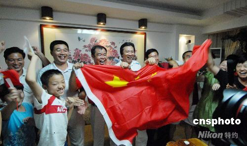8月17日晚,“超級丹”林丹獲得北京奧運羽毛球男單金牌,林丹的父親林建斌和數十名親友在福建省龍巖市上杭縣家中為其舉旗慶賀。中新社發 林福達 攝