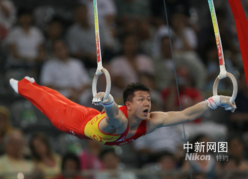 8月18日,中國選手陳一冰在北京奧運會吊環決賽中表現出色,奪得金牌。中新社記者 武仲林 攝