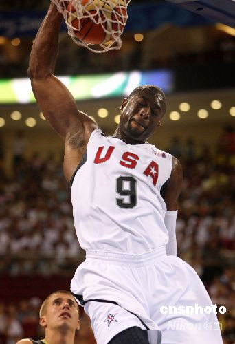 8月18日,北京奧運會男籃小組賽最后一輪賽事在北京五棵松籃球館舉行,此前四戰四勝的美國“夢八隊”以106比57橫掃由NBA巨星德克·諾維茨基率領的德國隊,隊中各員大將輪流上演扣籃絕技。美國隊的勝利確保了中國隊進入前八席位。圖為韋德在扣籃。 中新社發 任晨鳴 攝