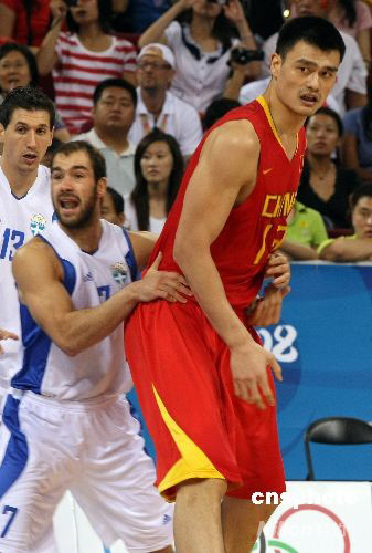 北京奧運會男子籃球小組賽第五輪比賽8月18日在五棵松籃球館舉行,由姚明統率的中國隊與世界勁旅希臘隊為八強位置展開激戰。中新社發 任晨鳴 攝