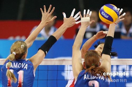 8月19日晚,衛冕冠軍中國女排在北京奧運會四分之一決賽中,以3:0戰勝俄羅斯女排,成功晉級四強。 中新社發 武仲林 攝